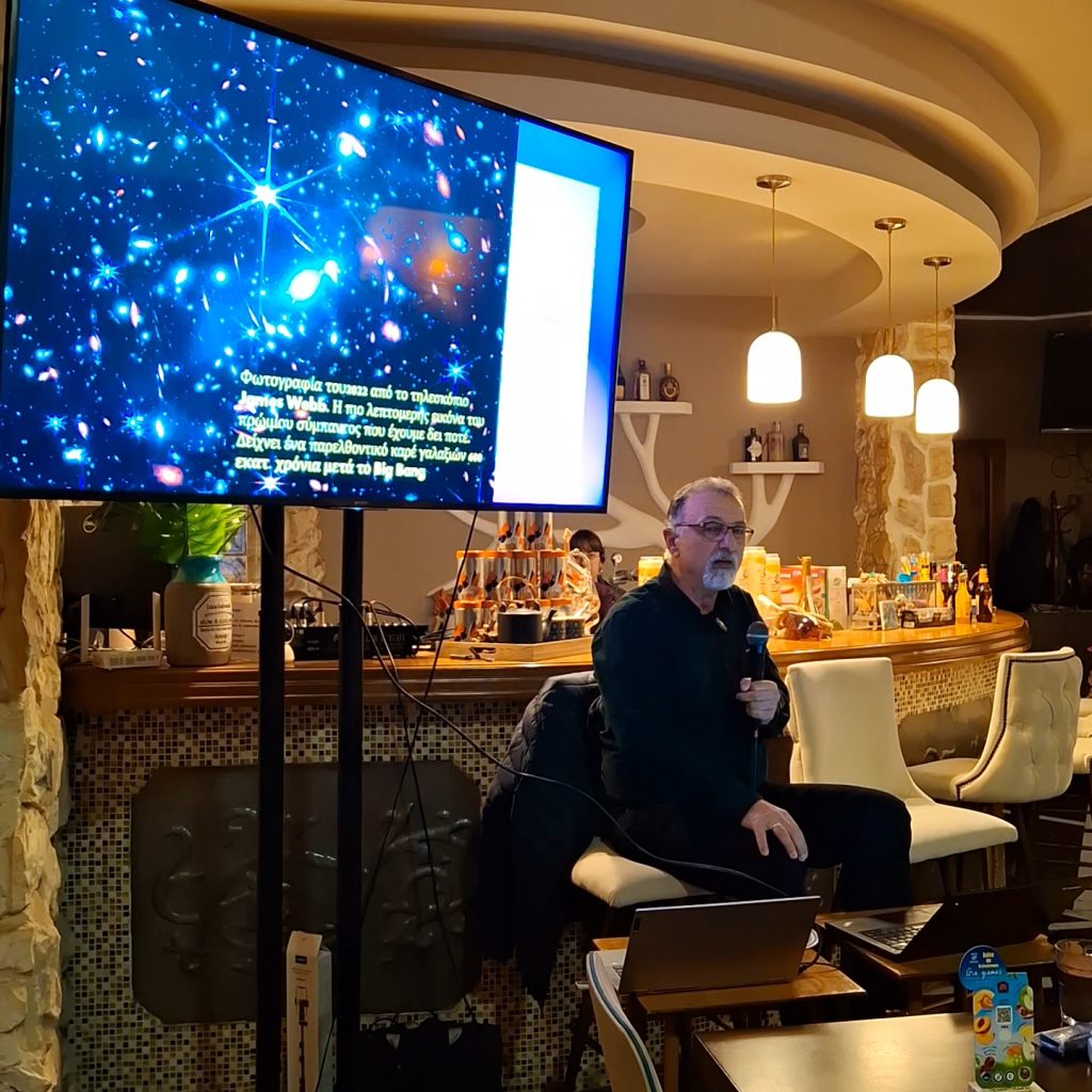 Το θέμα της συζήτησης περιστράφηκε γύρω από τις ανακαλύψεις της Αστροφυσικής που αφορούν τη φύση, τη δομή και τα όρια του σύμπαντος, καθώς και τον τρόπο που οι ανακαλύψεις αυτές επηρεάζουν την αντίληψή μας για τη ζωή και τον εαυτό μας.