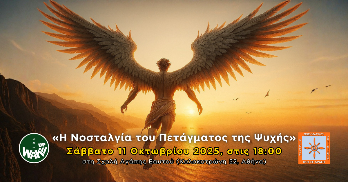 Στο πλαίσιο των δράσεων της Αφυπνιστικής Εκπαίδευσης σας προσκαλούμε στην ομιλία του Ψυχιάτρου-Ψυχοθεραπευτή, Ιδρυτή της Κίνησης «ΦΩΣ ΣΕ ΔΡΑΣΗ» και Συγγραφέα, κ. Γιάννη Αυγουστάτου, στη Σχολή Αγάπης Εαυτού (Κολοκοτρώνη 52, Αθήνα), όπου θα εξεταστεί η σχέση μυθολογίας και ψυχολογίας και θα διερευνηθεί η νοσταλγία του πετάγματος της ψυχής.