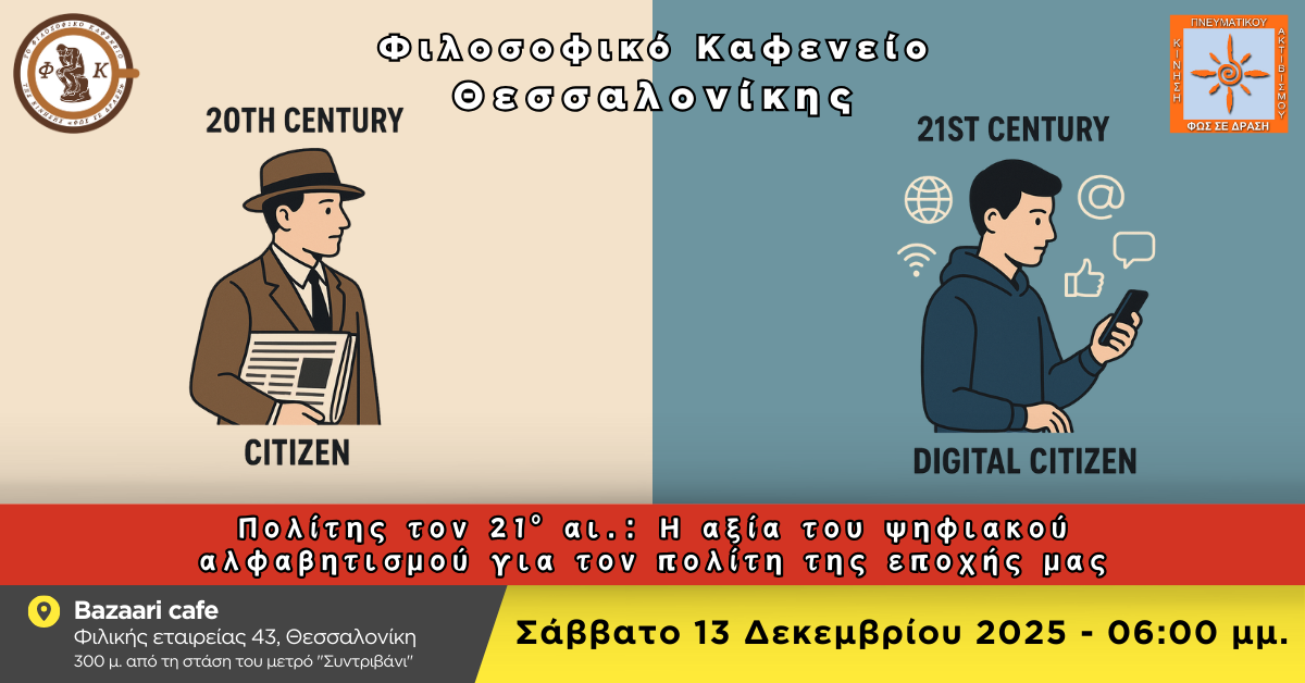 Το Φιλοσοφικό Καφενείο Θεσσαλονίκης μας προσκαλεί το Σάββατο 13/12/2025, στις 6:00 μ.μ. στο Bazaari cafe (Φιλικής εταιρείας 43, Θεσσαλονίκη, 300 μ. από τη στάση του μετρό “Συντριβάνι”) για να φιλοσοφήσουμε όλοι μαζί και να μοιραστούμε τις σκέψεις μας – Θέμα συζήτησης: «Πολίτης τον 21ο αι.: Η αξία του ψηφιακού αλφαβητισμού για τον πολίτη της εποχής μας».