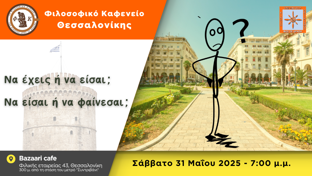 Το Φιλοσοφικό Καφενείο Θεσσαλονίκης σας προσκαλεί με χαρά στην επόμενη συνάντηση που θα πραγματοποιηθεί το Σάββατο 31/05/2025, στις 7:00 μ.μ. στο Bazaari cafe (Φιλικής εταιρείας 43, Θεσσαλονίκη, 300 μ. από τη στάση του μετρό "Συντριβάνι") για να φιλοσοφήσουμε όλοι μαζί και να μοιραστούμε τις σκέψεις μας.Ποια είναι, κατά τη γνώμη σου, η σωστή απάντηση στα […]
