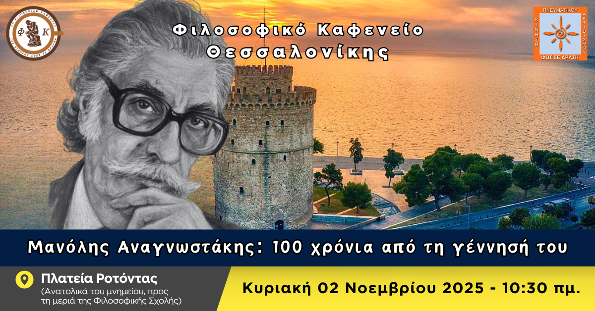 Το Φιλοσοφικό Καφενείο Θεσσαλονίκης μας προσκαλεί με χαρά σε έναν μοναδικό περίπατο στα χνάρια του ποιητή Μανόλη Αναγνωστάκη, που έζησε και συνέγραψε στην πόλη μας, με την ευκαιρία των 100 χρόνων από τη γέννησή του, την Κυριακή 02/11/2025, στις 10:30 π.μ. στην πλατεία Ροτόντας (ανατολικά του μνημείου, προς τη μεριά δηλαδή της Φιλοσοφικής Σχολής) για […]