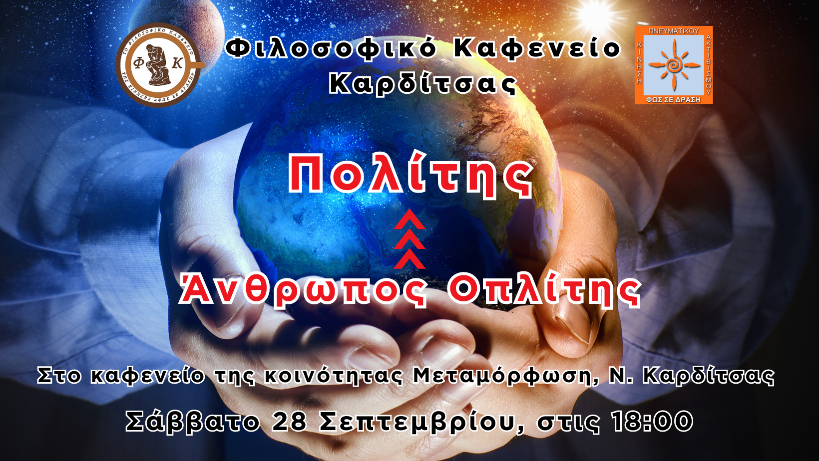 Το Φιλοσοφικό Καφενείο Καρδίτσας της Κίνησης "ΦΩΣ ΣΕ ΔΡΑΣΗ" επανέρχεται!Σας καλούμε να εγκαινιάσουμε τον τρίτο κατά σειρά κύκλο συζητήσεων για αν-ήσυχους πολίτες με κεντρική θεματολογια τον άνθρωπο και την ποιότητα ζωής.Μπήκαμε στην εποχή του φθινοπώρου! Ή αλλιώς στην άνοιξη του χειμώνα!Ο σύγχρονος πολίτης ποια εποχή του, διανύει;Ποιος είναι ο κοινός παρονομαστής ανάμεσα στον Αριστοτέλη τον […]