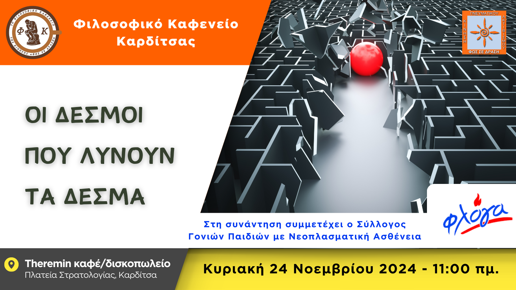 Το Φιλοσοφικό Καφενείο Καρδίτσας σας προσκαλεί στην επόμενη συνάντηση που θα πραγματοποιηθεί την Κυριακή 24 Νοεμβρίου 2024, στις 11:00 το πρωί στο καφέ-δισκοπωλείο Theremin (Πλατεία Στρατολογίας, Καρδίτσα), για να φιλοσοφήσουμε και να μοιραστούμε επιγνώσεις, πάνω στο θέμα «Οι Δεσμοί που λύνουν τα Δεσμά».-Τι είναι αυτό που μας δεσμεύει και τι αυτό που μας απελευθερώνει προσωπικά […]