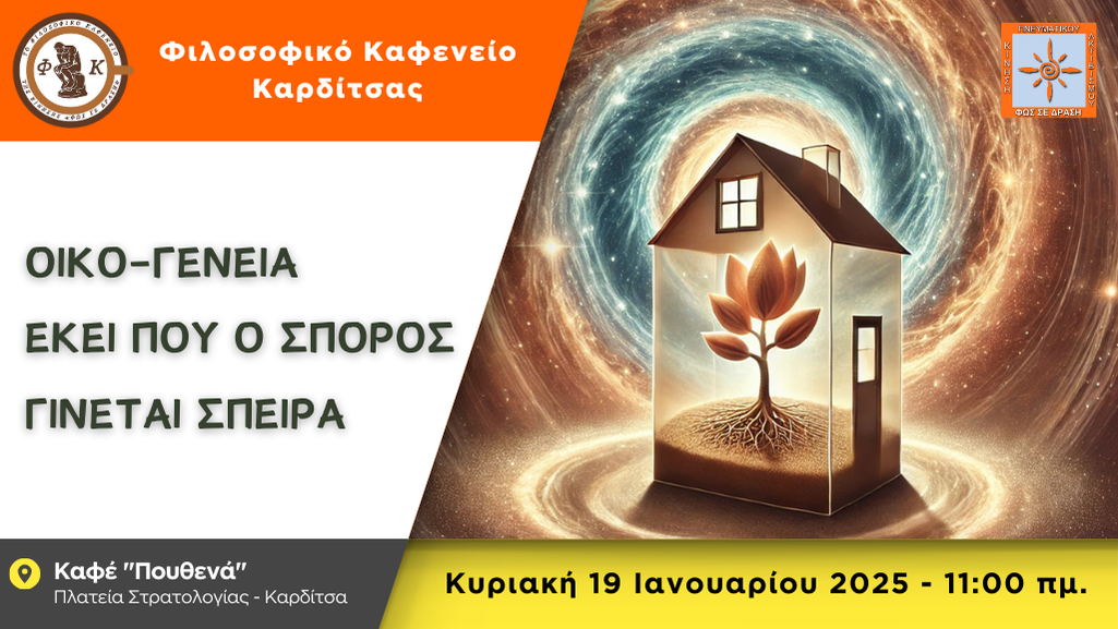 Φίλες και φίλοι του Φιλοσοφικού Καφενείου Καρδίτσας, την Κυριακή 19 Ιανουαρίου 2025, σας καλούμε να διερευνήσουμε μαζί πώς η σχέση του σπόρου, του σπιτιού και της σπείρας γίνεται το ιδανικό μοντέλο για την κατανόηση της ζωής ως μιας διαρκούς πορείας εξέλιξης, ριζωμένης στην ασφάλεια και στην αγάπη.Αυτό το σκεπτικό συσχετίζεται με αρχαίες ελληνικές ιδέες, όπως […]