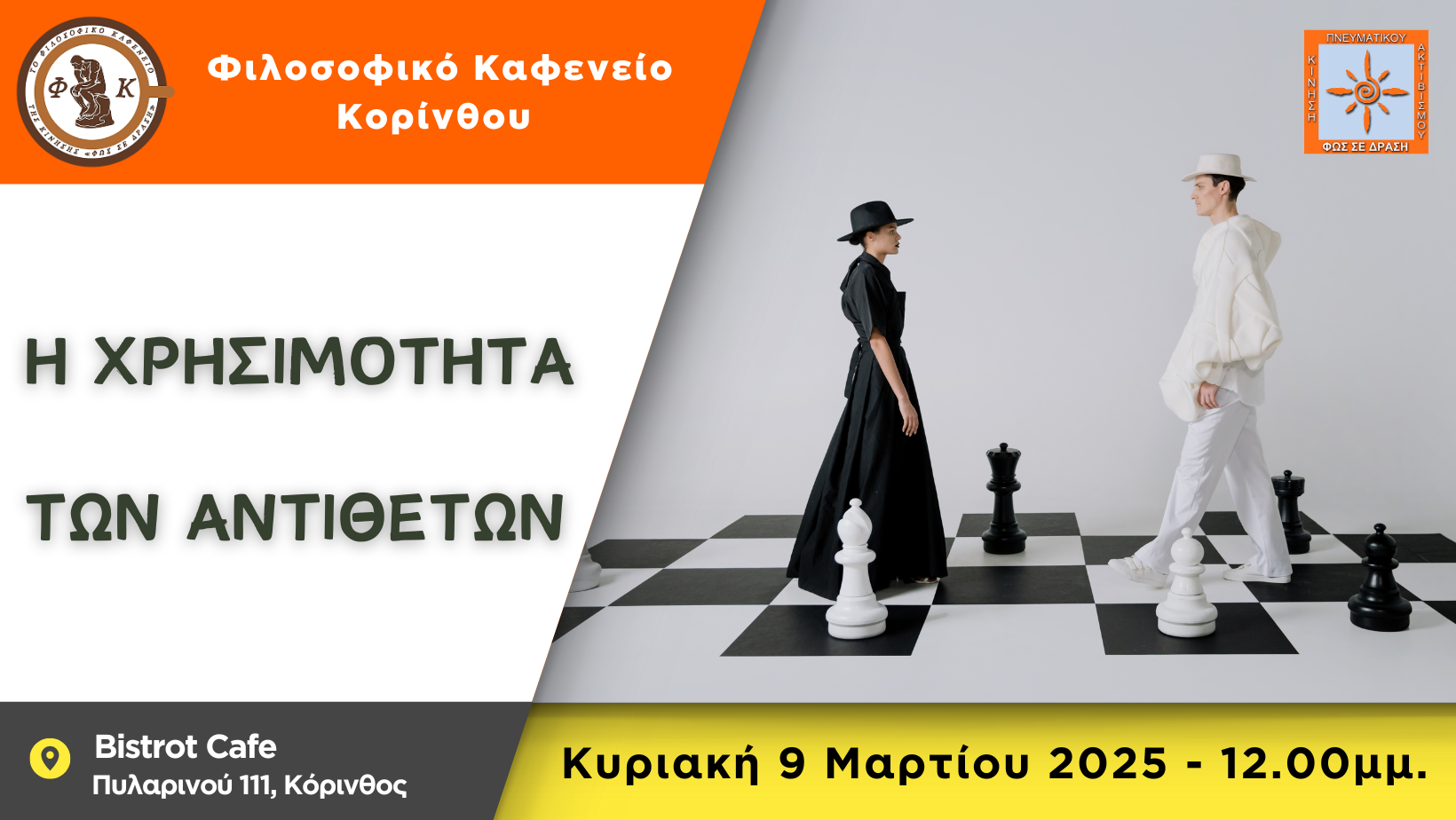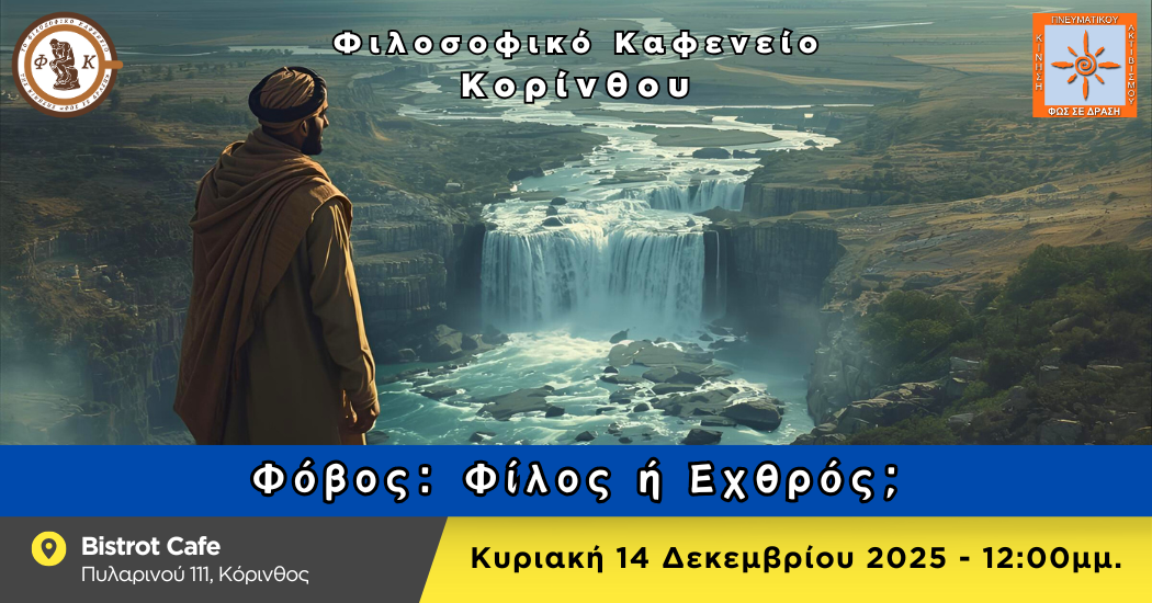 Το Φιλοσοφικό Καφενείο Κορίνθου μας προσκαλεί την Κυριακή 14/12/2025, στις 12:00 μμ. στο Bistrot Cafe (Πυλαρινού 111 – Κόρινθος), με θέμα συζήτησης: «Φόβος: Φίλος ή Εχθρός;».Μπορούμε άραγε να δούμε τον φόβο σαν ένα φίλο; Μπορούμε να πούμε ξεκάθαρα ότι ο φόβος είναι εχθρός;Μήπως ο φόβος είναι και τα δυο, μεταμφιεσμένος κάθε φορά, άλλοτε με το κουστούμι […]