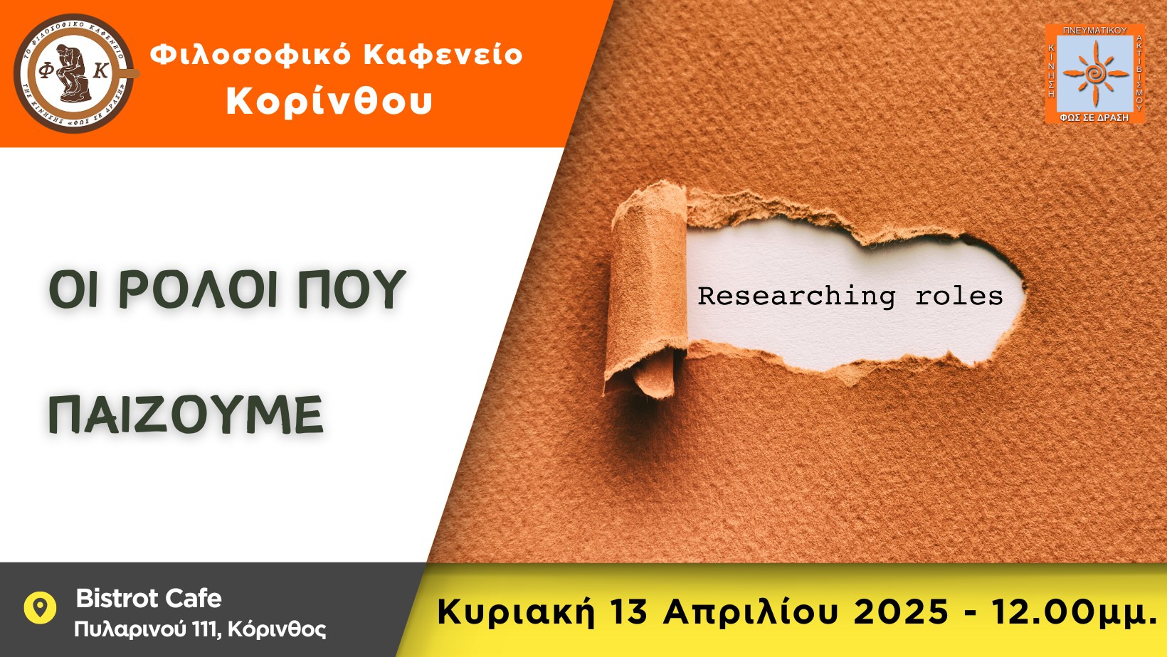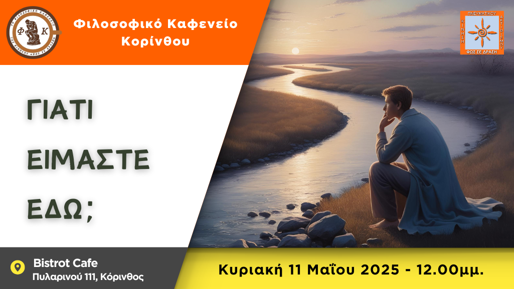 Το Φιλοσοφικό Καφενείο Κορίνθου μας προσκαλεί την Κυριακή 19/04/2026, στις 12:00 μμ. στο Bistrot Cafe (Πυλαρινού 111 – Κόρινθος), με θέμα συζήτησης: «Νόμος της Έλξης: Μύθος ή Πραγματικότητα;».Ίσως θα χρειαστεί να αναλογιστούμε μέσα από τις παρατηρήσεις μας, σε δύο ερωτήσεις.- Είμαστε μαγνήτες που μαγνητίζουμε αυτό που επιθυμούμε;- Ή είμαστε μαγνήτες που μαγνητίζουμε αυτό που μέσα μας περισσότερο δονείται;Αλλά ακόμα, μήπως όπως […]