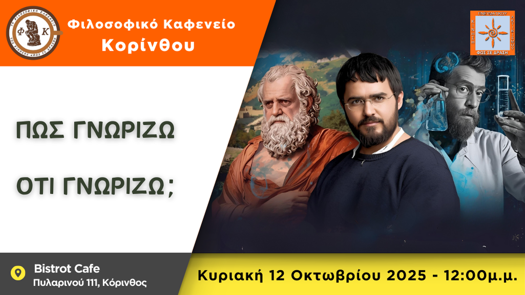 Το Φιλοσοφικό Καφενείο Κορίνθου μας προσκαλεί την Κυριακή 12/10/2025, στις 12:00 μμ. στο Bistrot Cafe (Πυλαρινού 111 – Κόρινθος), με θέμα συζήτησης: «Πώς γνωρίζω ότι γνωρίζω;» :Και σε ένα ταξίδι με ανατροπές και εμπόδιο πως καταφέρνω να πω πως γνωρίζω ότι γνωρίζω;Σας περιμένουμε να αναρωτηθούμε και να μοιραστούμε τις επιγνώσεις μας - Είσοδος ελεύθερη!Εισηγητές: Λένα […]