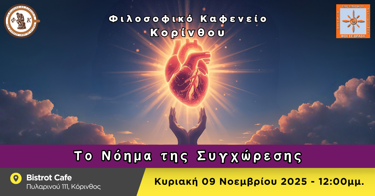 Το Φιλοσοφικό Καφενείο Κορίνθου μας προσκαλεί την Κυριακή 09/11/2025, στις 12:00 μμ. στο Bistrot Cafe (Πυλαρινού 111 – Κόρινθος), με θέμα συζήτησης: «Το νόημα της Συγχώρεσης».Το θέμα αυτό θα μπορούσε άραγε να αναχθεί και σε νόημα ζωής;Όταν επιδιώκουμε την απελευθέρωση από τα δυσάρεστα συναισθήματα;Όταν επιδιώκουμε την ευθυγράμμιση του σωματικού, νοητικού και συναισθηματικού μας κέντρου;Όταν επιδιώκουμε […]
