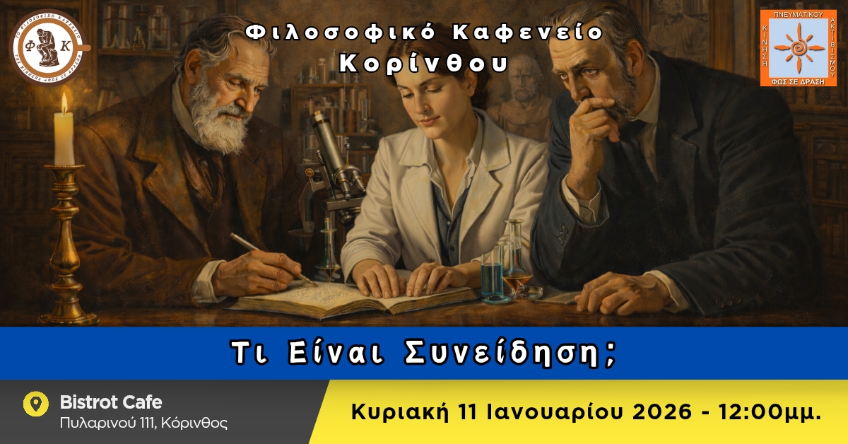 Το Φιλοσοφικό Καφενείο Κορίνθου μας προσκαλεί την Κυριακή 11/01/2026, στις 12:00 μμ. στο Bistrot Cafe (Πυλαρινού 111 – Κόρινθος), με θέμα συζήτησης: «Τι Είναι Συνείδηση;».Το ερώτημα «Τι είναι Συνείδηση;», είναι το μεγαλύτερο μυστήριο που ο άνθρωπος ως έλλογο ον προσπαθεί να απαντήσει. Και μέχρι στιγμής με αυτά που γνωρίζουμε είναι το μοναδικό είδος που θέλει […]