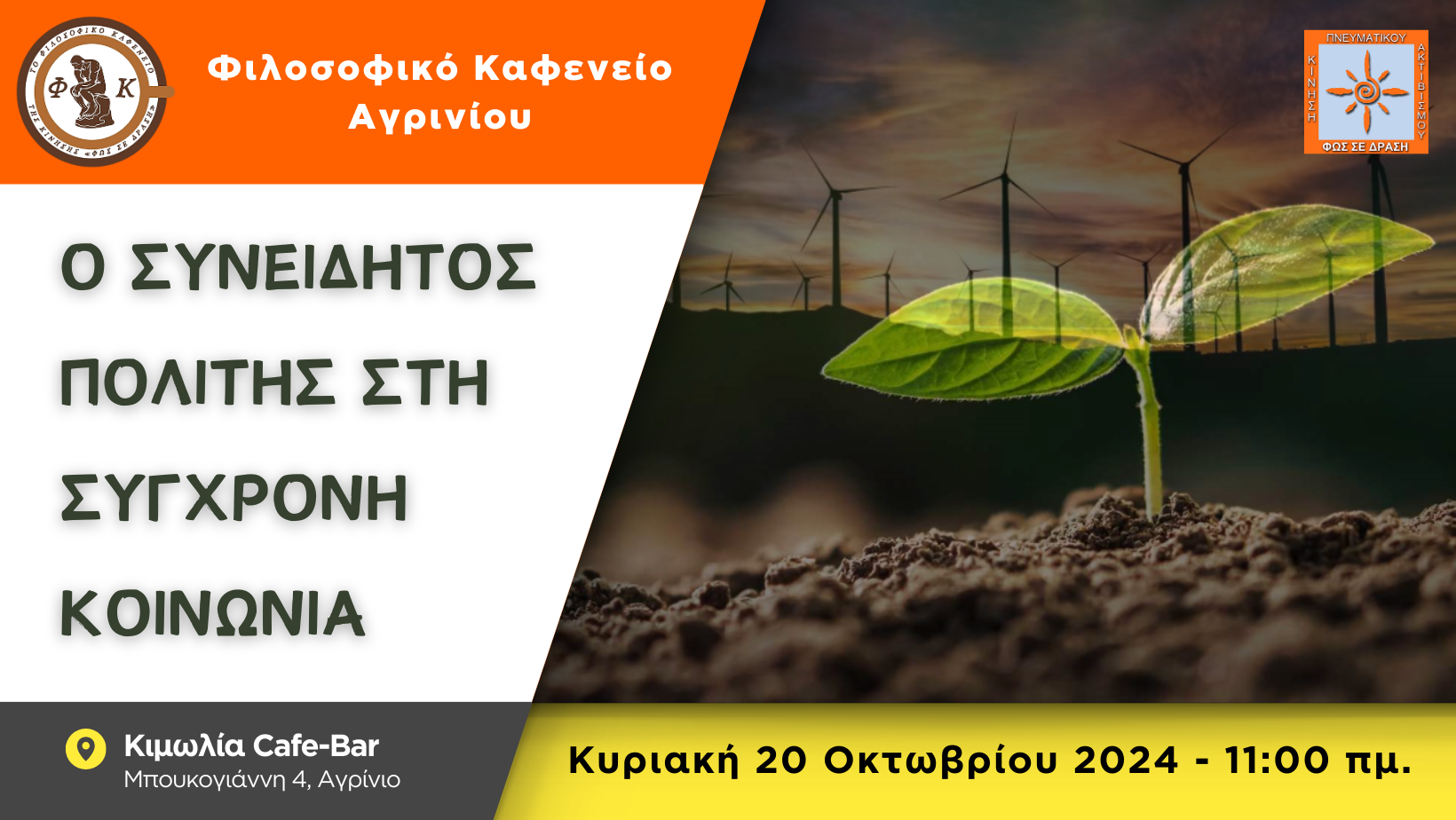 Το Φιλοσοφικό Καφενείο Αγρινίου επανέρχεται!Στο ξεκίνημα της φετινής χρονιάς θα μελετήσουμε το σημαντικό θέμα της έμπρακτης συμμετοχής των πολιτών στην κοινωνία, που απαντά άλλωστε και στο συνηθισμένο ερώτημα: «Κι εμείς τί μπορούμε να κάνουμε, αφού τα πράγματα είναι δύσκολα;»Στην αλληγορία του Σπηλαίου του Πλάτωνα ένα σύνολο ατόμων ζουν όλη τους τη ζωή αλυσοδεμένοι και ακίνητοι […]