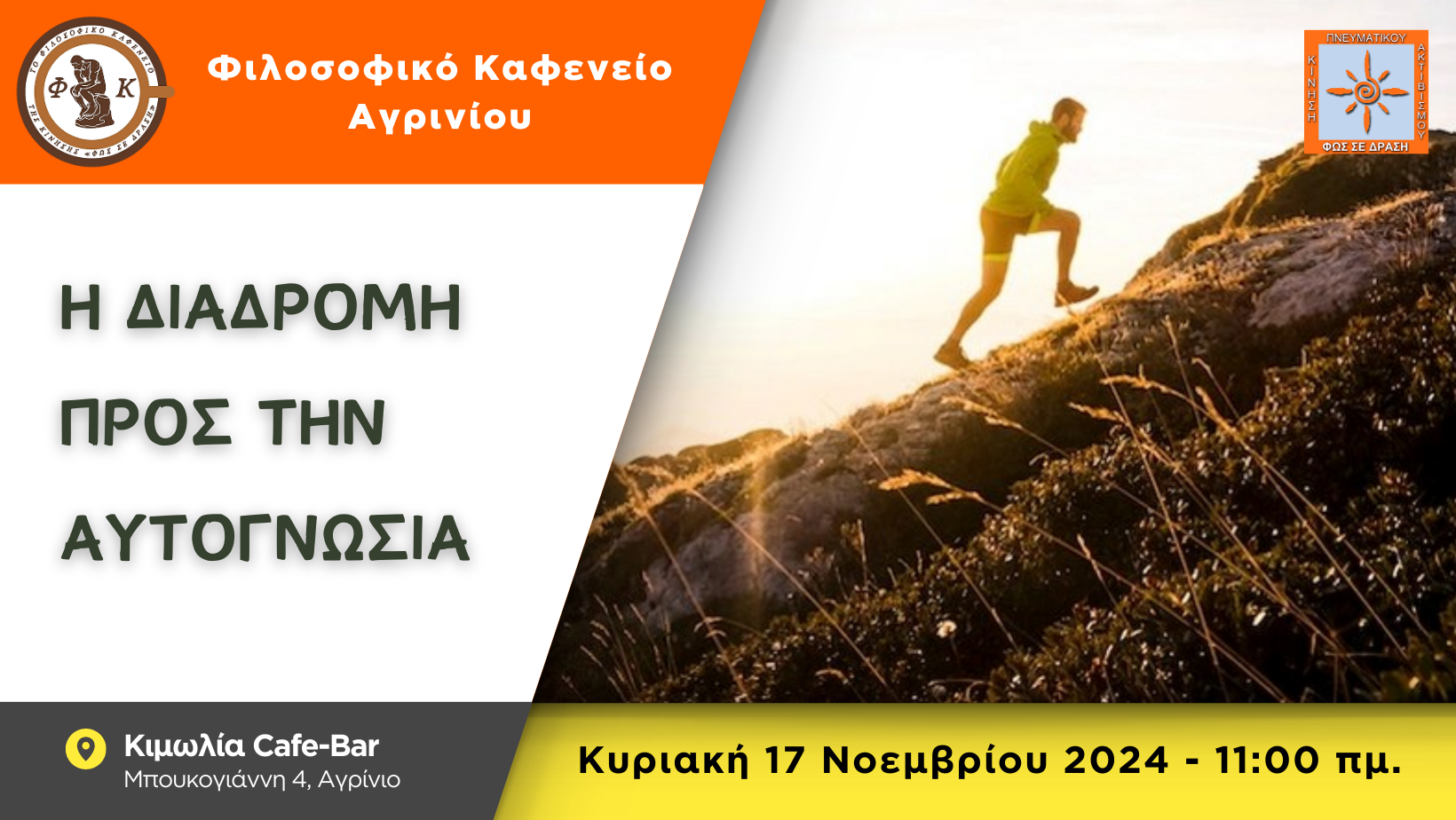 Το Φιλοσοφικό Καφενείο Αγρινίου μας προσκαλεί στην επόμενη συνάντηση, με θέμα συζήτησης: «Η Διαδρομή προς την Αυτογνωσία».Στην εποχή της υπερπληροφόρησης και του υπερκαταναλωτισμού ανθούν τα επικερδή και πολυδιαφημισμένα σεμινάρια που "διδάσκουν" την εύκολη επιτυχία, το άκοπο κέρδος και τη σίγουρη ευτυχία. Πολλοί άνθρωποι προσπαθούν να ενσαρκώσουν εξωτερικά το νέο, παραμένοντας εσωτερικά οι ίδιοι.Την προτεραιότητα της […]