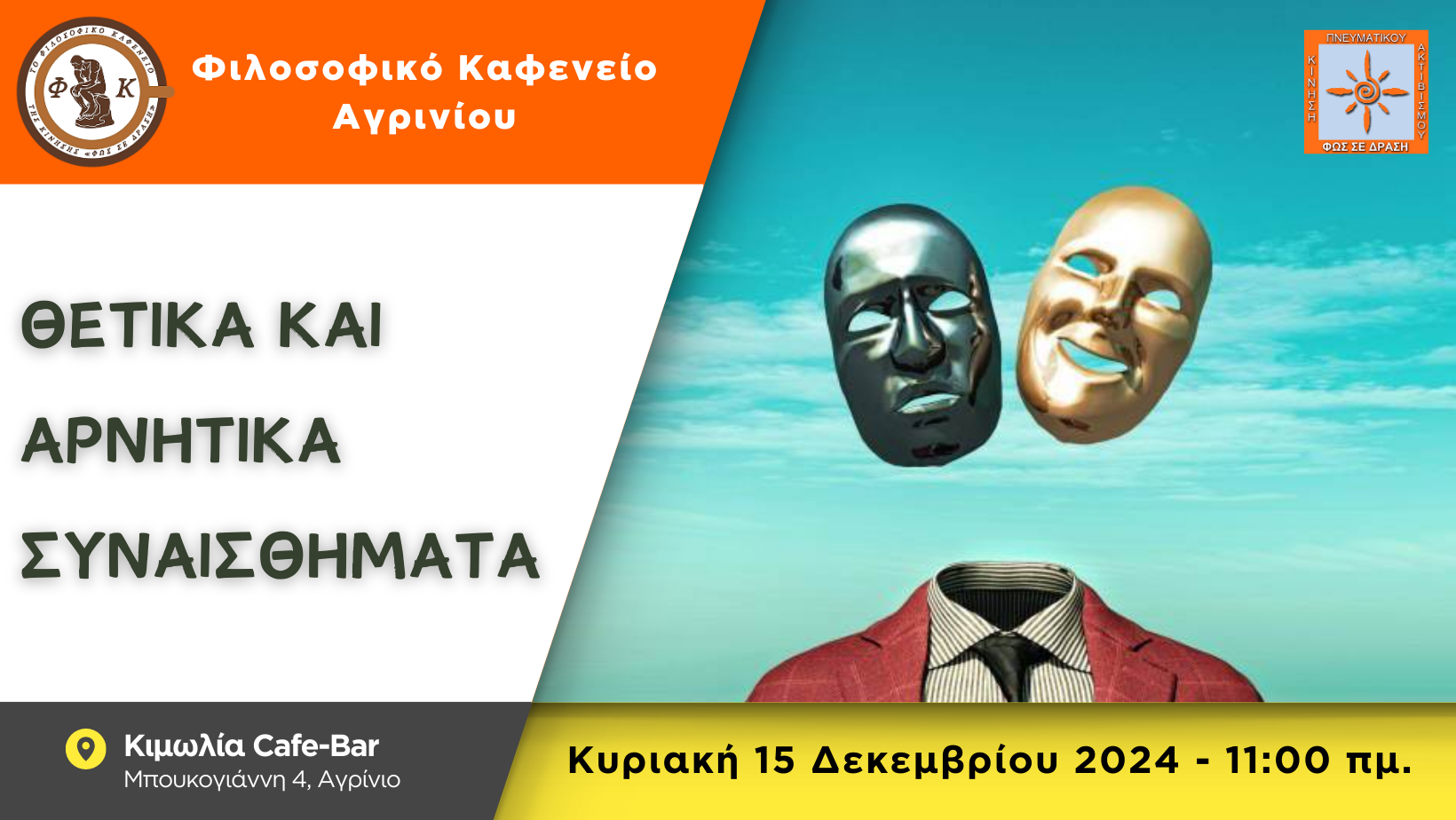 Το Φιλοσοφικό Καφενείο Αγρινίου μας προσκαλεί στην επόμενη συνάντηση που θα πραγματοποιηθεί την Κυριακή 15/12/2024, στις 11:00 π.μ. στο Κιμωλία Cafe-Bar (Μπουκογιάννη 4- Αγρίνιο), με θέμα συζήτησης: "Θετικά και Αρνητικά Συναισθήματα".Σας περιμένουμε όλους να μοιραστούμε εμπειρίες πάνω σε αυτό το πολυσυζητημένο θέμα.Εισηγητές: Έλενα Τριανταφυλλίδη και Χρήστος ΖερβόπουλοςΕίσοδος ελεύθερη!