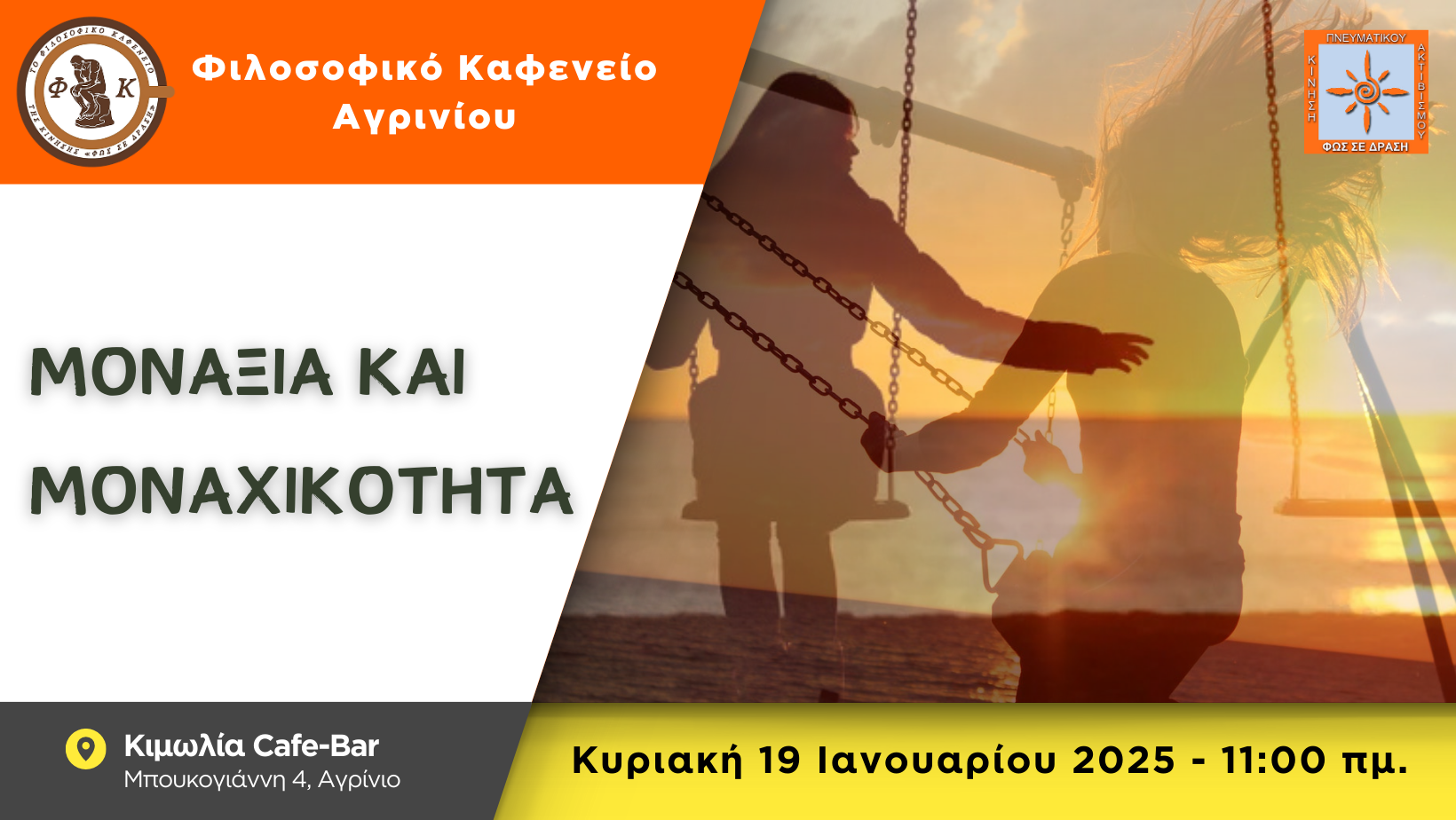 Με το νέο έτος το Φιλοσοφικό Καφενείο Αγρινίου μας προσκαλεί στην επόμενη συνάντηση που θα πραγματοποιηθεί την Κυριακή 19 Ιανουαρίου 2025, στις 11 π.μ., στο Κιμωλία Cafe-Bar (Μπουκογιάννη 4- Αγρίνιο) για να φιλοσοφήσουμε πάνω στο θέμα "ΜΟΝΑΞΙΑ ΚΑΙ ΜΟΝΑΧΙΚΟΤΗΤΑ".Σε μία από τις ομιλίες του ο Osho αναφέρει: "Οι άνθρωποι χρειάζονται τα πλήθη. Αυτός είναι ο […]