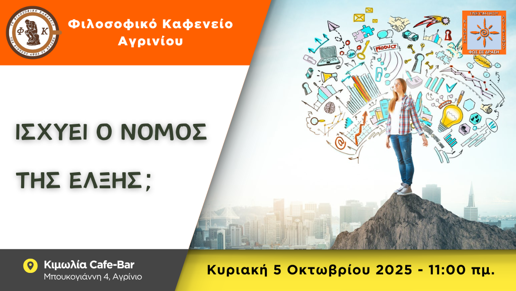 Το Φιλοσοφικό Καφενείο Αγρινίου επιστρέφει και μας προσκαλεί στην επόμενη συνάντηση που θα πραγματοποιηθεί την Κυριακή, 05/10/2025, στις 11:00 π.μ. στο Κιμωλία Cafe-Bar (Mπουκογιάννη 4 - Αγρίνιο) για να ανταλλάξουμε απόψεις πάνω στο πολυδιαφημιζόμενο θέμα του κινήματος της Νέας Εποχής σχετικά με το νόμο της έλξης.Εισηγητής: Κωνσταντίνος ΣαμψώνΣας περιμένουμε - Είσοδος ελεύθερη!