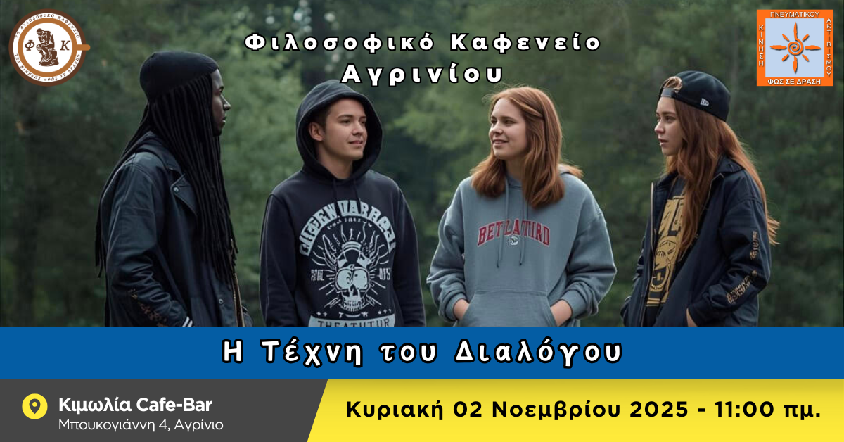 Το Φιλοσοφικό Καφενείο Αγρινίου μας προσκαλεί στην επόμενη συνάντηση που θα πραγματοποιηθεί την Κυριακή, 02/11/2025, στις 11:00 π.μ., στο Κιμωλία Cafe-Bar (Mπουκογιάννη 4, Αγρίνιο).Θα συζητήσουμε για το διάλογο ως τρόπου εποικοδομητικής επικοινωνίας στις ανθρώπινες σχέσεις, αλλά και ως τέχνης του φιλοσοφείν στη ζωή μας.Σας περιμένουμε - Είσοδος ελεύθερη!Εισηγητές: Έλενα Τριανταφυλλίδη και Χρήστος Ζερβόπουλος